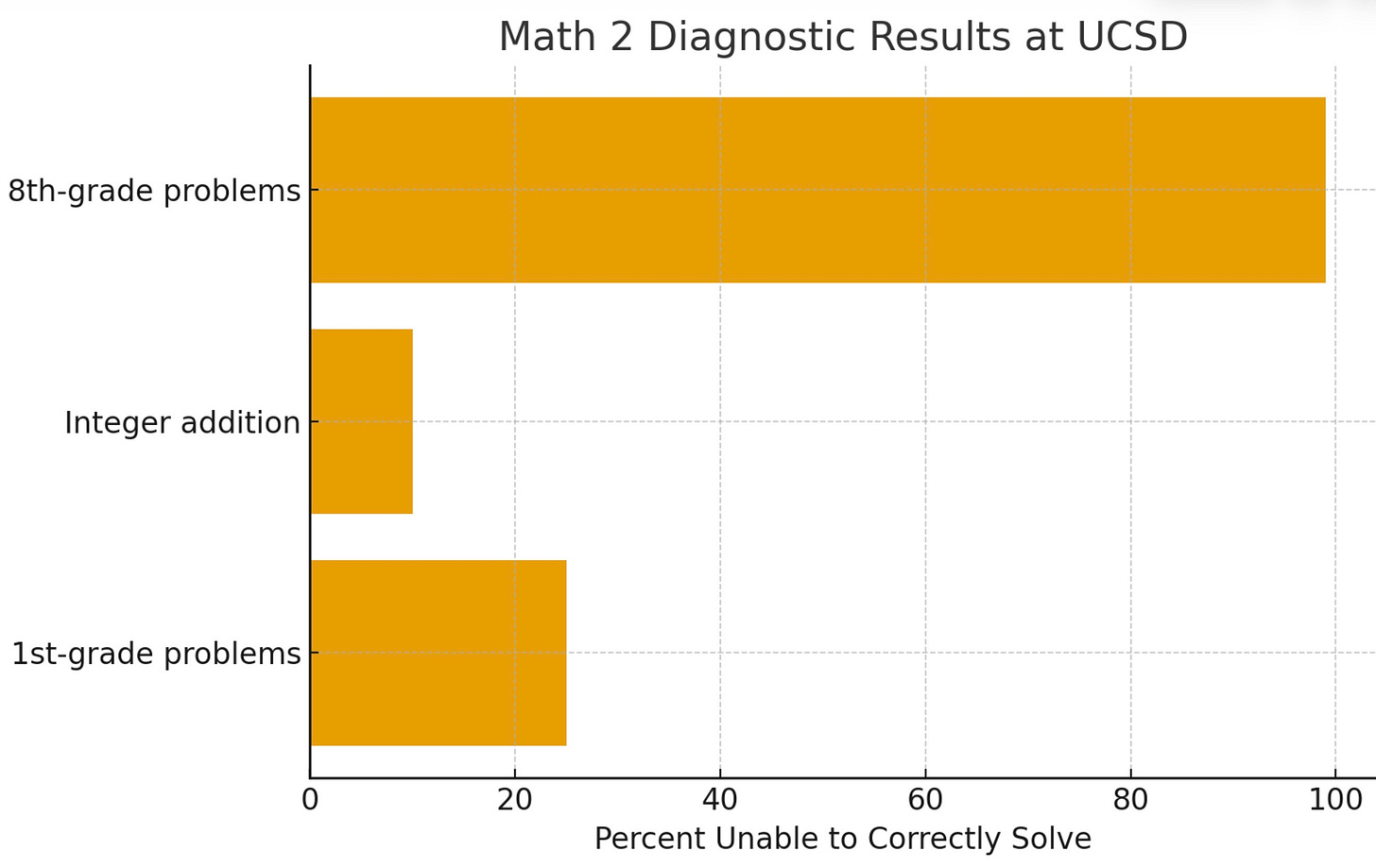 The details get worse. UCSD gives a diagnostic assessment to “Math 2” students — the group placed in the university’s lowest remedial class because their skills fall at the elementary or middle school level. In this cohort, students struggled with basic arithmetic, simple integer addition, and even rounding. Roughly 25% missed a first-grade level number-balance question, 61% failed to round 374,518 to the nearest hundred, and fewer than one in five could solve an eighth-grade problem.