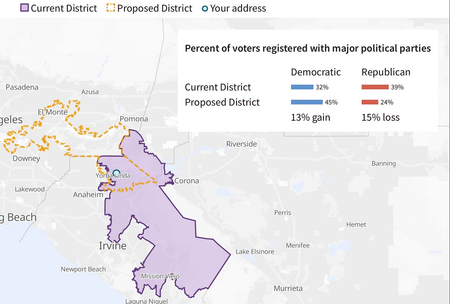 And below — well you can see where I punched my address into their nifty tool and you can see where I currently live in a Republican district represented by Congresswoman Young Kim, but how I will be gerrymandered into a Democratic district represented by Congresswoman Linda Sanchez.