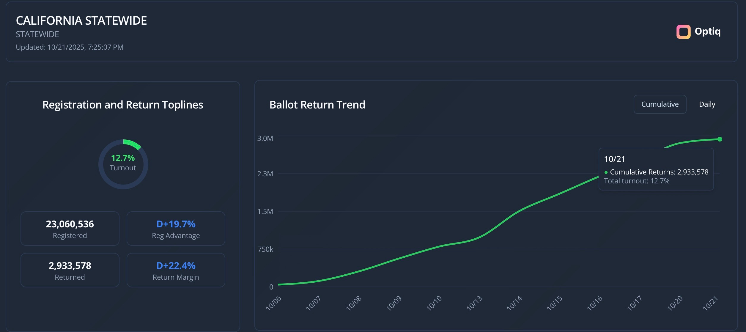 Thanks to our friends at Optiq here is a dashboard that gives you access to more data about the Prop. 50 election turnout than you could possibly want. (By the way, it’s actually counter-intuitive to write a word that ends in a q. Who knew?)