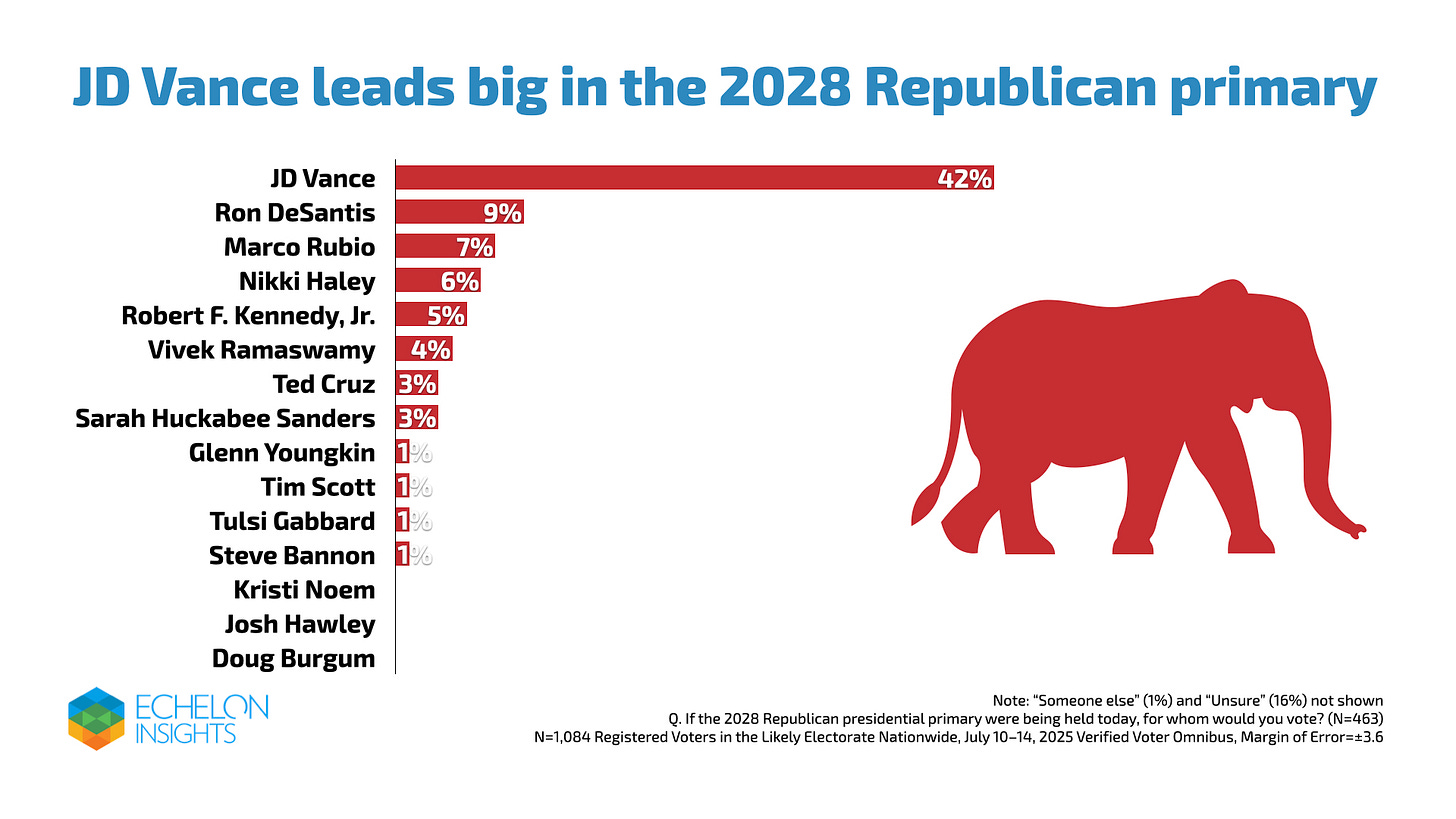 The latest Echelon Insights Verified Voter Omnibus, conducted June 10–14, polled 1,084 likely voters with a margin of error of +/- 3.6 points. In the hypothetical 2028 Republican primary, J.D. Vance leads with 42 percent, far ahead of the field. Imagine a GOP field where one person already has plurality support—something you don’t normally see this far out. Rounding out the top tier are Ron DeSantis at 9 percent, Marco Rubio at 7 percent, and Nikki Haley at 6 percent, while other names—Robert F. Kennedy Jr., Vivek Ramaswamy, Ted Cruz, and Sarah Huckabee Sanders—trickled in between 3–5 percent. That kind of early consolidation is unusual and suggests Vance may be locking down support well ahead of the formal nomination fight.