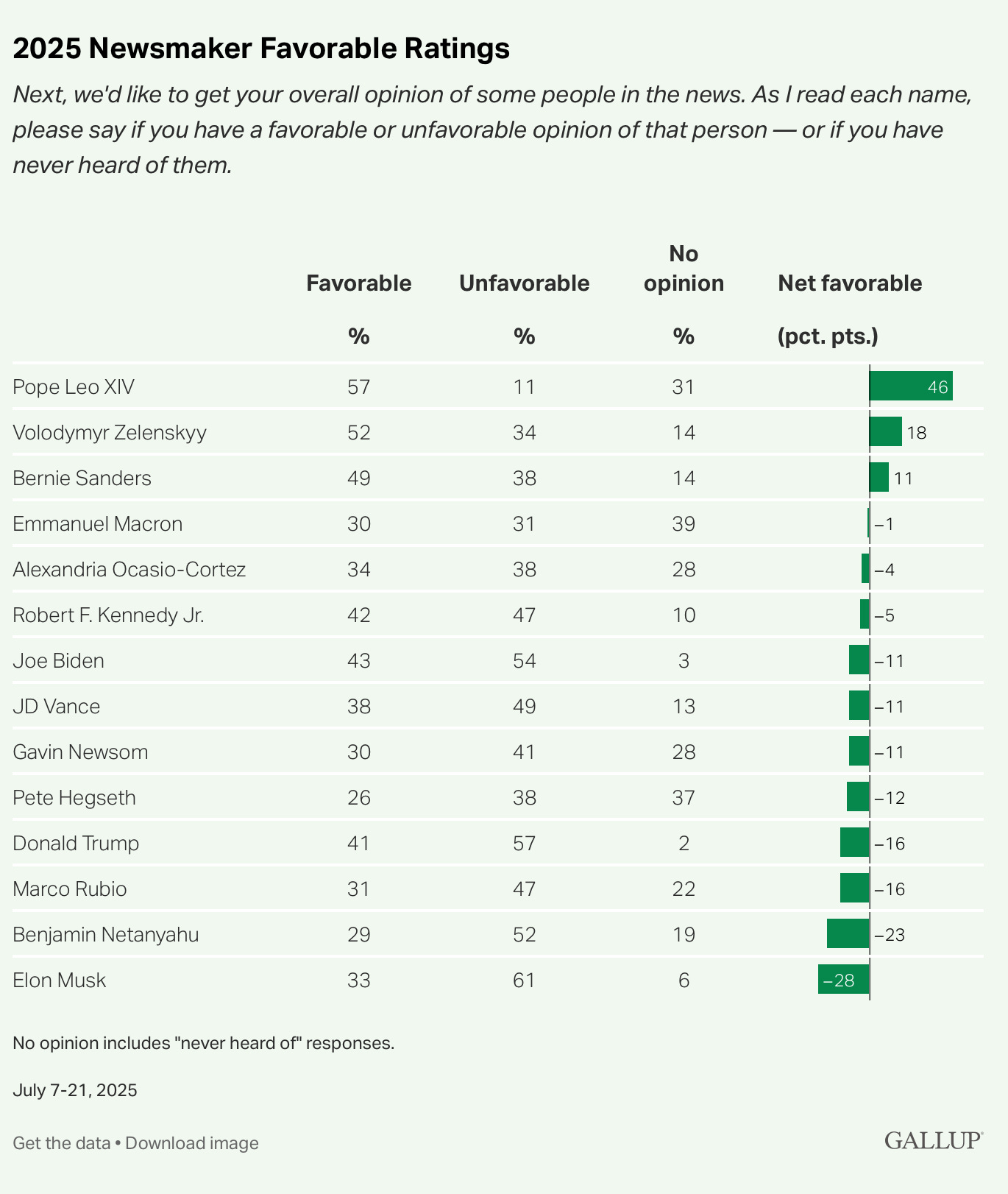A separate Gallup survey, polling roughly 1,000 adult Americans during July 7–21, measured net favorability ratings across 14 public figures. Topping the list was Pope Leo XIV, the first American pontiff, with a +46 net favorability—57 percent favorable vs. just 11 percent unfavorable. At the bottom was Elon Musk, at -28 net (33 percent favorable, 61 percent unfavorable), going from admired to questioned in a matter of weeks. The contrast illustrates how public sentiment can swing dramatically based on recent behavior or narrative framing.