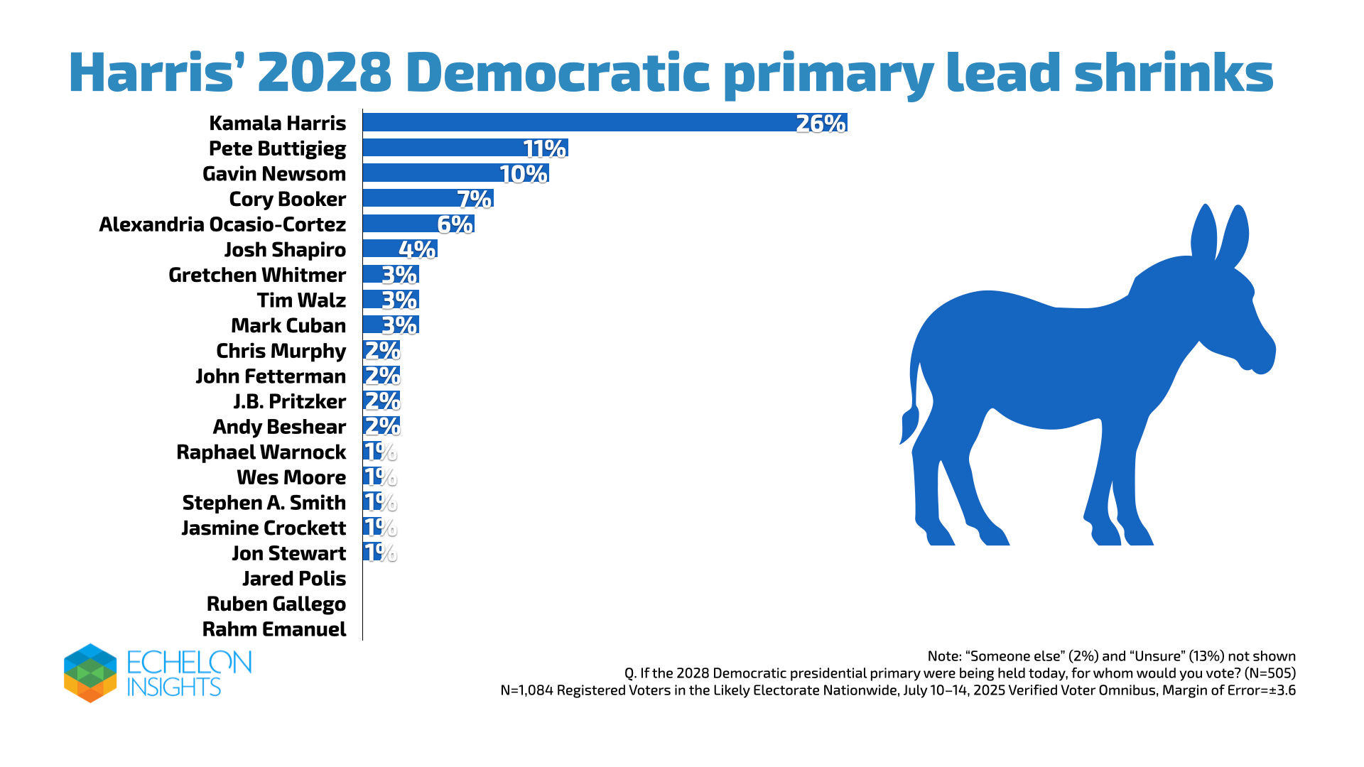 In a parallel question, Echelon asked respondents to choose among potential Democratic nominees including Vice President Kamala Harris. From the same sample and timeline, Harris garnered 26 percent, followed by Pete Buttigieg (11 percent), Gavin Newsom (10 percent), Cory Booker (7 percent), and AOC (6 percent), with Josh Shapiro, Mark Cuban, and Gretchen Whitmer in the 3–5 percent range. Harris leads, but her support is modest, leaving plenty of room for shifts before anyone casts a ballot.