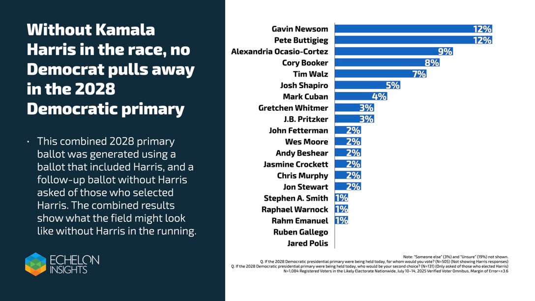 Echelon followed up with respondents who had initially selected Harris—offering them a second-choice ballot without her. The combined projection showed Buttigieg and Newsom tied at 12 percent, AOC at 9 percent, Booker at 8 percent, Tim Walz at 7 percent, then Josh Shapiro (5 percent) and Mark Cuban (4 percent) trailing. Harris’ presence seems to hold a big chunk of the center-left vote in place. Take her off the board, and the field suddenly looks wide open.