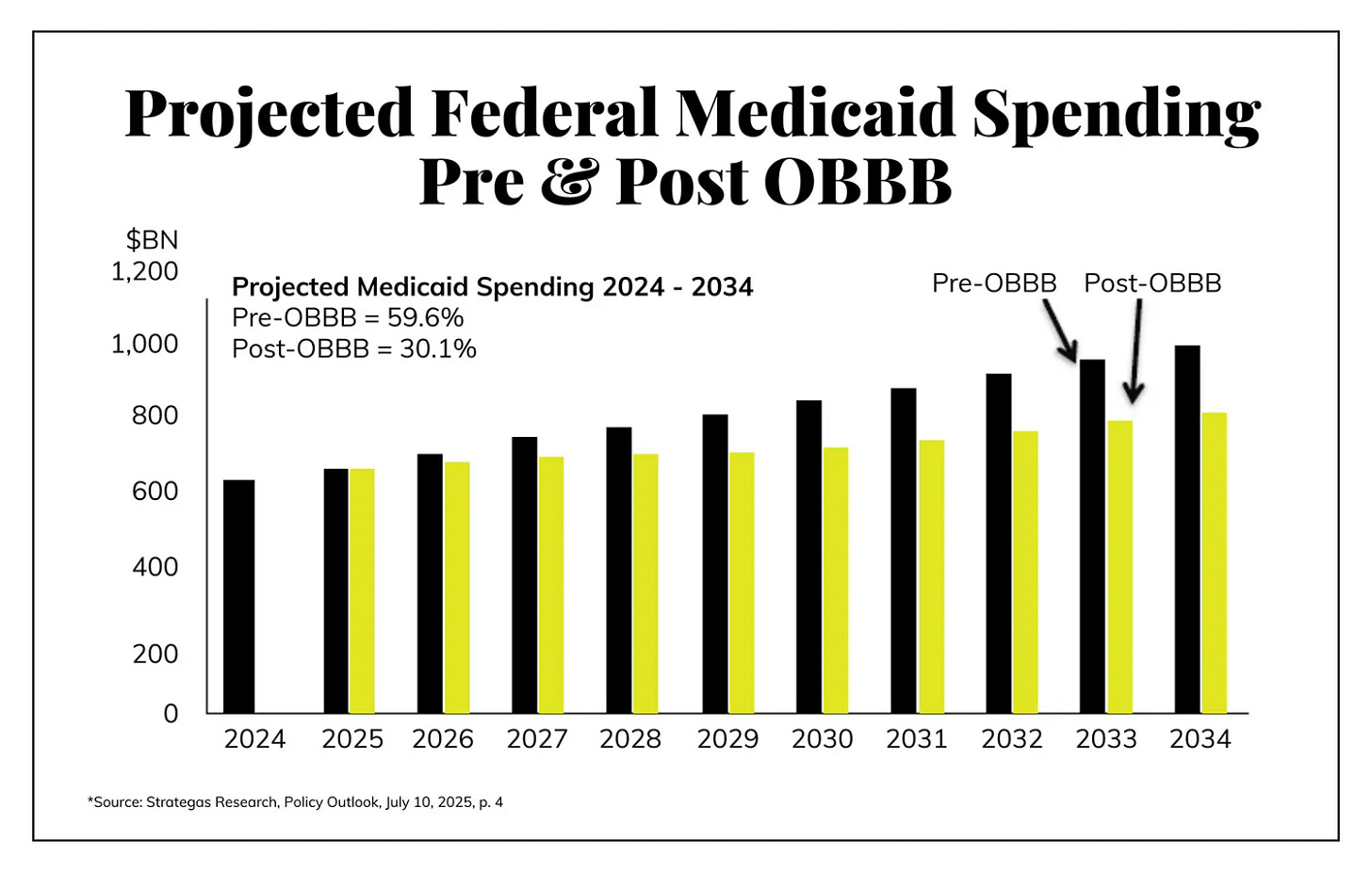 The OBBA trims $1.5 trillion over ten years from planned increases in Medicaid, student loans, and renewable energy. David clarifies these are not cuts but slowed growth. Medicaid changes, delayed until 2028, focus on removing ineligible enrollees and adding work requirements. With federal spending at $6.8 trillion annually, the $150 billion yearly savings is modest, David notes, insufficient to tackle the broader fiscal challenge. I flat out “borrowed” this chart from David’s Dividend Cafe post to give you a visual on how the “cuts” to Medicaid spending over the next decade or so are actually reductions in planned increases in Medicaid spending. Any reductions are more than welcome, but context is alway important.