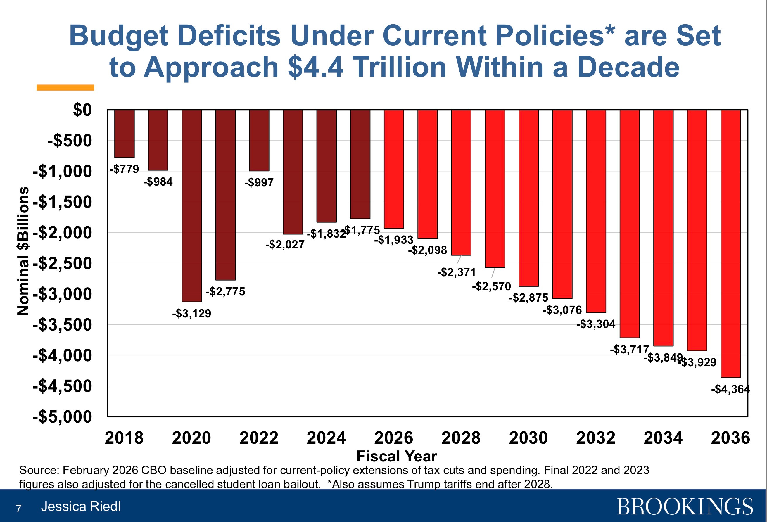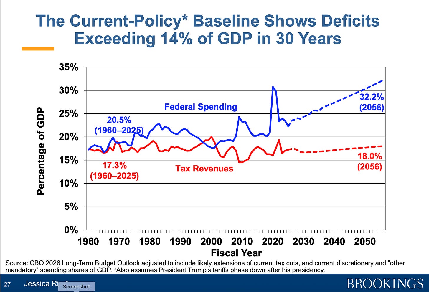That is why Jessica Riedl’s annual chart book matters. Riedl, a budget and tax fellow at the Brookings Institution, has built a reputation for doing something too few people in Washington are willing to do: laying out the fiscal truth plainly, directly, and with receipts. The 2026 edition, Spending, Taxes, and Deficits: A Book of Charts, is another year’s worth of truth-telling about a government that keeps borrowing, deferring, and pretending the bill will never come due.