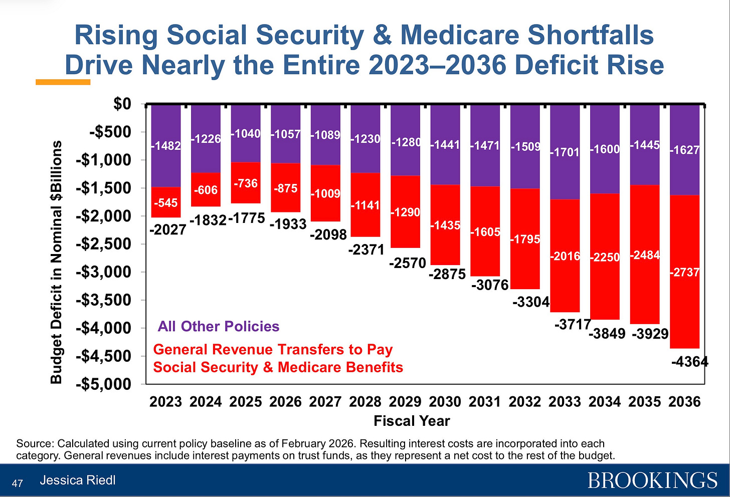 The chart on page 47 shows that the worsening deficit over that period is driven overwhelmingly by the growing cost of financing Social Security and Medicare shortfalls. That is the debate Washington hates most, because it forces elected officials to confront the parts of the budget they are most afraid to touch.