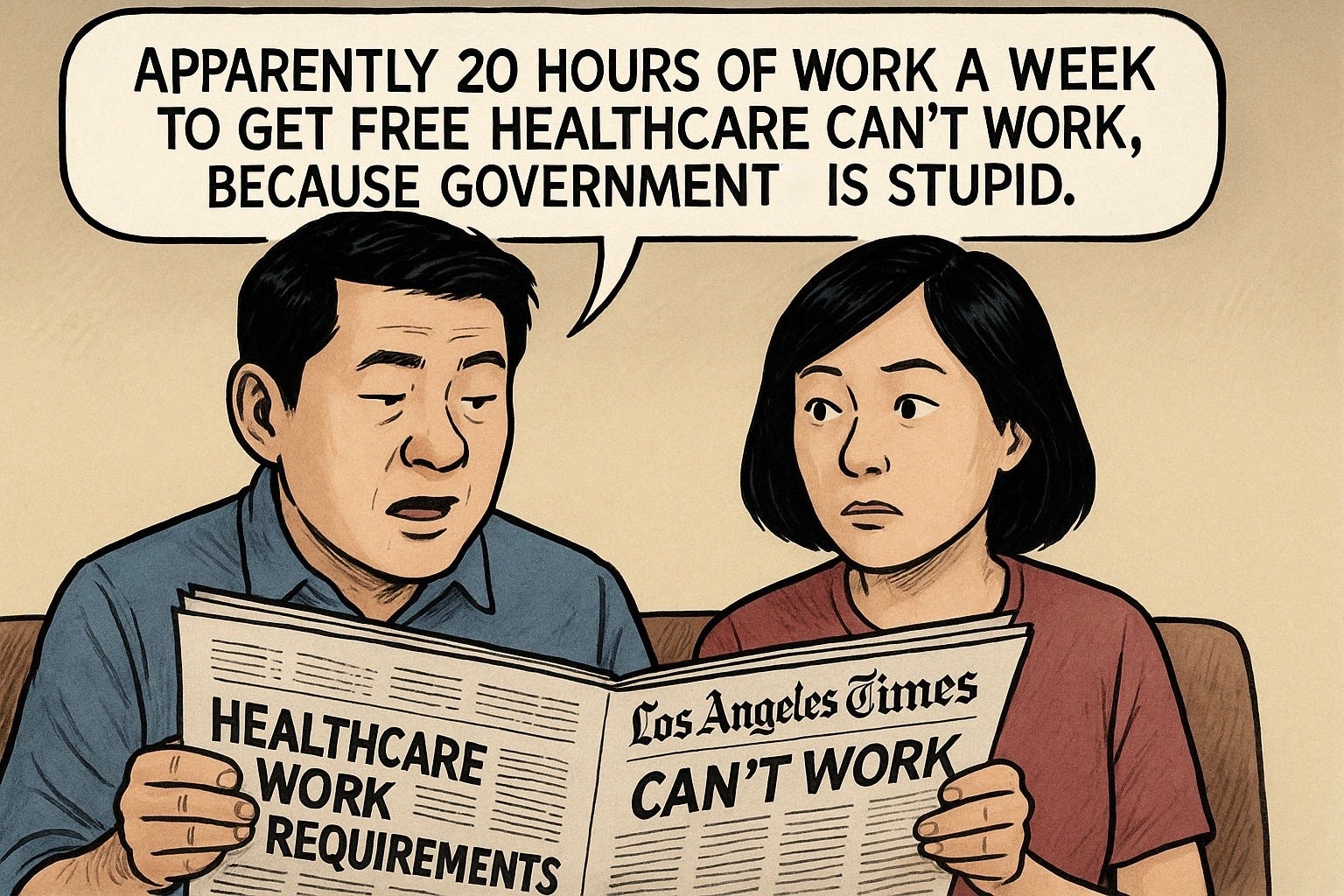 The Los Angeles Times’ coverage in a story yesterday, dissing on the impractical Medicaid work requirements in the “One Big Beautiful Bill Act” that was just signed into law, reads like it might have wandered off the editorial page. The article presents the “expert” point of view that verifying 80 hours a month of work, volunteering, or education for able-bodied adults (19–64) as a looming bureaucratic disaster, with no significant counterpoint to suggest these requirements are pretty reasonable, and certainly no voice saying that if you cannot verify work, then the benefits should not be available. I felt like the article was making a quiet case for “healthcare as a human right,” as it seems like they are implying that if you cannot verify the work you should not cut off the free benefits, leaving readers wondering if personal responsibility has any place in the discussion.
