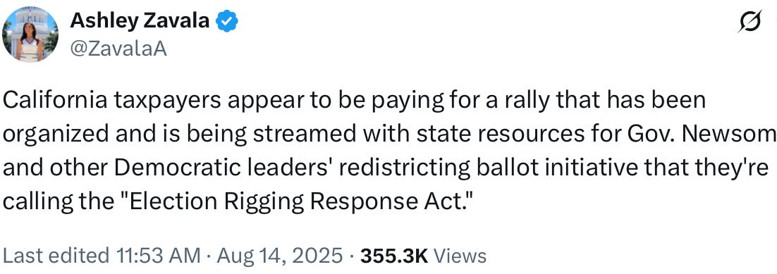 KCRA reporter Ashley Zavala is a winner this week for her relentless investigative journalism exposing waste, fraud, and abuse in California’s state Capitol. Her dogged pursuit of truth, from uncovering conflicts of interest to breaking stories on misuse of public funds, holds lawmakers accountable. As president of the Capitol Correspondents Association, Zavala’s fearless reporting, like her exposés on non-disclosure agreements, sets a gold standard for political journalism. This week alone she has had great coverage on the redistricting scheme, Newsom’s use of state funds for his rally (see Newsom above), and more.