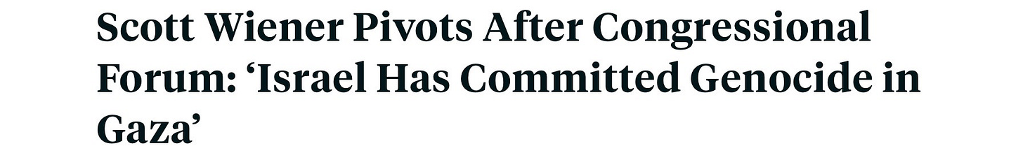 State Sen. Scott Wiener is a loser this week for reversing himself on the use of the word genocide to describe the war in Gaza. He initially refused to use the term, acknowledging its gravity and the stakes involved, but later changed course after sustained pressure from local anti-Israel activist groups. The shift reads less like moral clarity and more like political pandering, with language recalibrated to satisfy a loud constituency rather than reflect consistent judgment on a serious and sensitive issue.