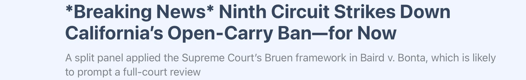 They ruled that California’s ban on open carry in most of the state violates the Second Amendment. In doing so, the panel applied the Supreme Court’s Bruen framework as written, rather than inventing new tests or deferring to Sacramento’s policy preferences. The opinion turned on history, not politics, concluding the state failed to justify a sweeping ban affecting nearly all Californians. That kind of judicial discipline is rare on the Ninth Circuit, even if the ruling is ultimately short-lived.