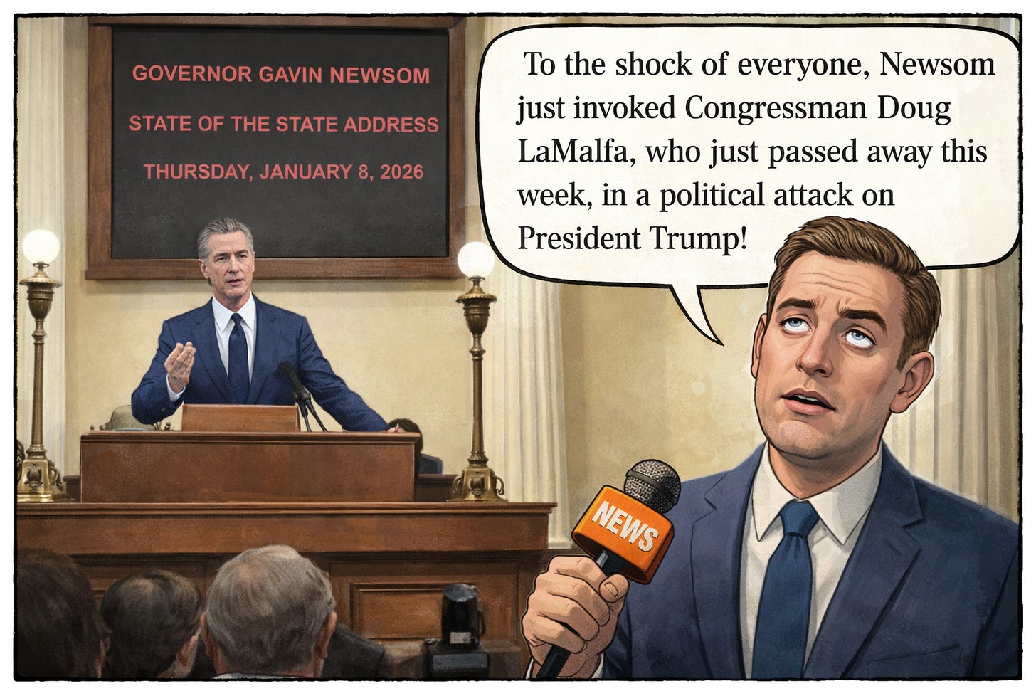He used the recent passing of Congressman Doug LaMalfa as a political prop in his State of the State address to take a cheap jab at President Trump. Exploiting a colleague’s death to score partisan points crossed a basic line of decency, even by Sacramento standards. It wasn’t leadership, policy, or vision — just a tone-deaf moment that reflected poorly on the office and distracted from the serious business Californians expect to hear about, not that Newsom said anything serious.