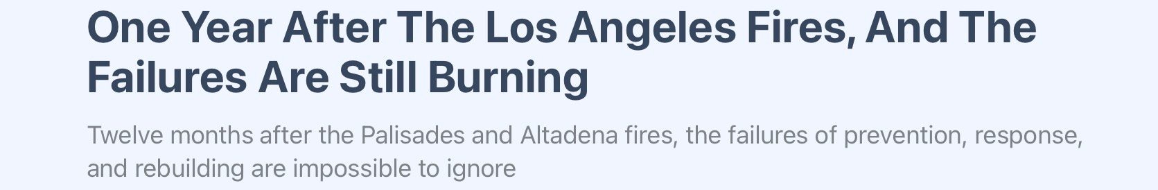 One year after the devastating Los Angeles fires, the city remains frozen in place, with rebuilding stalled and accountability nowhere to be found. Promises of urgency and flexibility gave way to bureaucratic paralysis and edited after-action reports. Instead of taking responsibility, Bass and her team are busy trying to whitewash critical after-action review documents meant to honestly assess what went wrong. Leadership is judged by outcomes, and the outcomes here are indefensible.