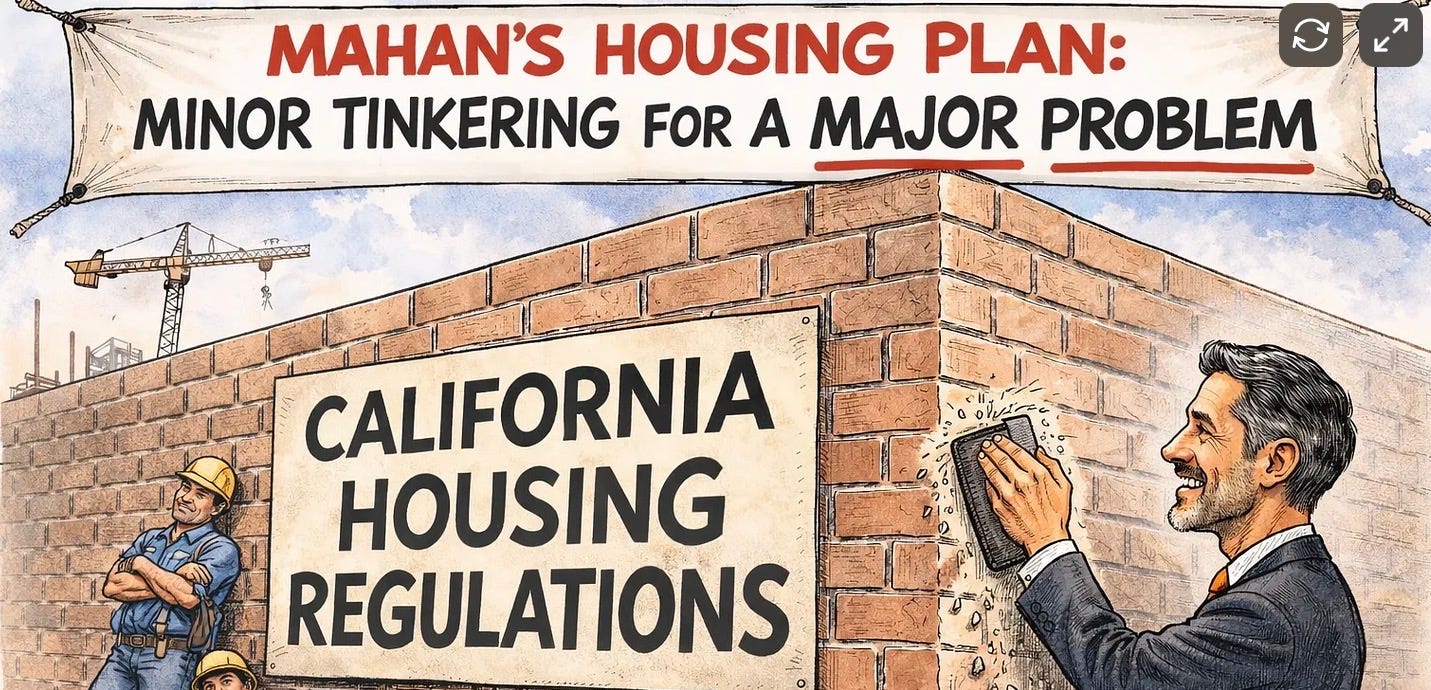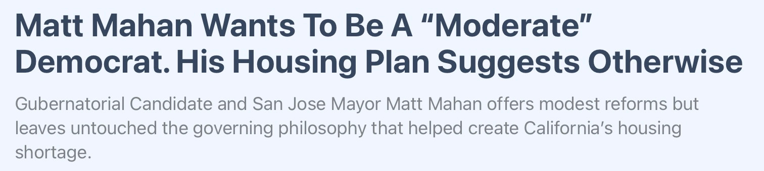 San Jose’s mayor is running for governor while positioning himself as a pragmatic “moderate” Democrat, but his newly released housing plan suggests otherwise. While it includes a few measures to ease construction costs, the proposal largely doubles down on the same centralized planning philosophy that created California’s housing crisis in the first place. Much of the plan’s regulatory relief is tied to dense infill housing in government-designated zones — reinforcing Sacramento’s belief that planners should decide where housing gets built.