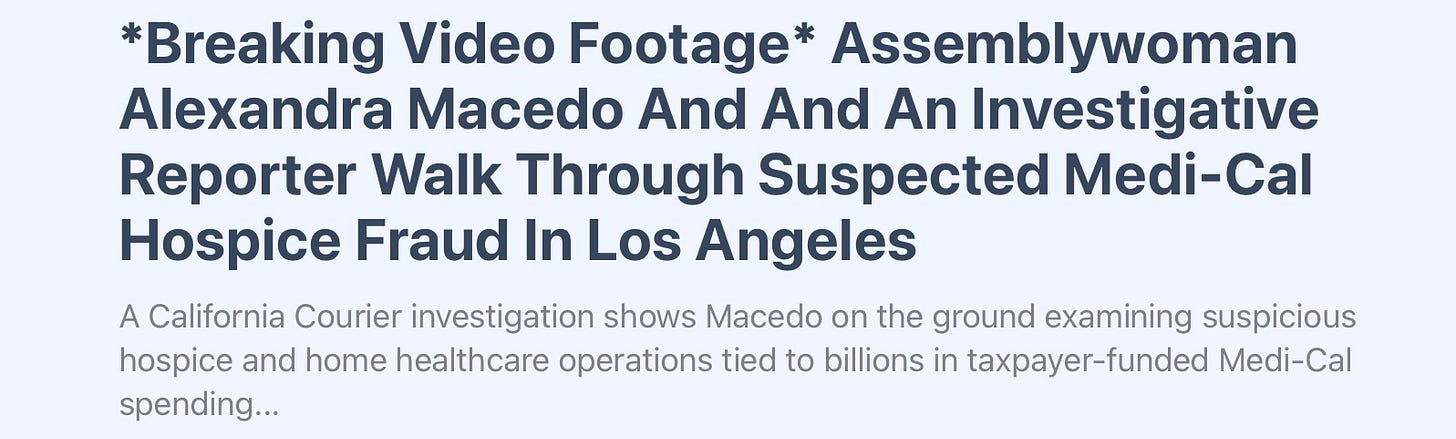 While many politicians are content to issue statements and hold press conferences, this Central Valley assemblywoman took a more direct approach. Working with California Courier investigative reporter Christian Hartsock, she personally visited multiple Los Angeles County addresses associated with hospice and home healthcare agencies that billed Medi-Cal. What they found raised serious questions: empty offices, deteriorating buildings, and locations that hardly resembled functioning healthcare providers. With billions in suspected Medi-Cal fraud tied to hospice operations in the region, her willingness to conduct a firsthand field investigation stands out as the kind of oversight taxpayers rarely see from Sacramento.