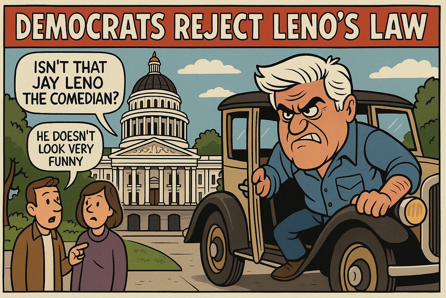 Comedian and former Tonight Show Host Jay Leno’s push for Senate Bill 712, dubbed “Leno’s Law,” was crushed by Sacramento Democrats on the Assembly Appropriations Committee. The bill, which would have exempted pre-1981 classic cars from smog tests, failed to advance, leaving Leno’s advocacy for California’s car culture stalled and his influence diminished in the face of environmentalist opposition. Not so funny :-(