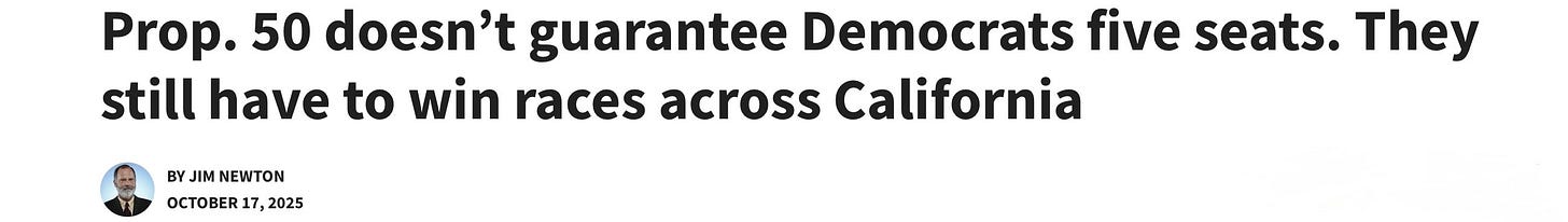 I have seen a lot columns for any against the gerrymandering in Prop. 50 — but Newton is the only person I have read who attempts (with a straight face) to write a column that seems to make the case that gerrymandering districts does not really pre-ordain outcomes. A naive, unsophisticated take, at best.