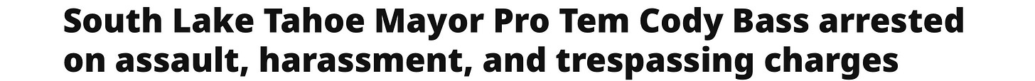 After the city saw its mayor resign amid a $300,000 embezzlement scandal, the remaining council members installed Cody Bass as interim mayor—despite his own legal baggage. Bass was arrested on misdemeanor charges of trespassing and harassment following a September nightclub altercation, with investigators citing surveillance footage that showed him as the aggressor. The appointment raises serious questions about judgment and credibility. I probably should have made the voters of South Lake Tahoe the losers — they need to make better choices.