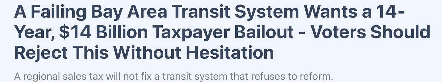 BART’s leadership has spent years ignoring structural reality, and now they’re asking taxpayers to bail them out for it. Ridership collapsed, remote work stuck, and instead of reforming operations, they doubled down on a bloated cost structure—especially labor. Now comes a proposed 14-year, $14 billion sales tax with no serious accountability. This isn’t a rescue plan; it’s an attempt to lock in failure. Voters are being asked to subsidize a system that refuses to modernize.