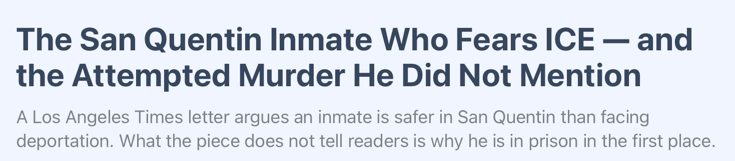 The LA Times chose to publish a sympathetic letter from a San Quentin inmate fearing deportation—but omitted the most critical fact: he’s serving a life sentence for attempted murder. That’s not a minor editorial oversight; it’s a failure of basic journalistic responsibility. Readers were given a carefully curated narrative designed to evoke sympathy without the context needed to evaluate it. A credible editorial page can have a point of view, but it cannot leave out the central fact that defines the story.