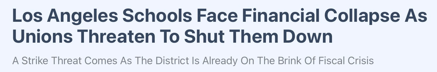 At a moment when Los Angeles Unified is staring down structural deficits, declining enrollment, and mounting legal liabilities, its two largest unions are threatening to shut the system down. This isn’t leverage—it’s recklessness. Demanding double-digit raises while the district burns through reserves ignores basic math. A strike would only deepen the financial hole and disrupt learning for hundreds of thousands of students. When the system is unstable, escalating demands don’t solve the problem—they accelerate the collapse.