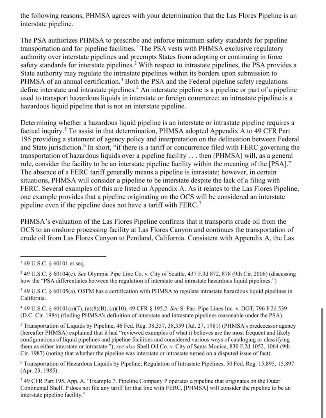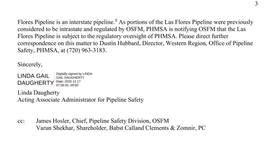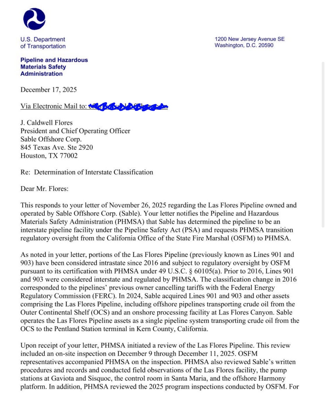 In a letter sent on Wednesday, the U.S. Department of Transportation’s Pipeline and Hazardous Materials Safety Administration (PHMSA) informed Sable Offshore Corporation that its Las Flores Pipeline system qualifies as an interstate pipeline under federal law. That determination places pipeline safety oversight under federal jurisdiction rather than California regulators, a consequential shift after years of delays and regulatory dead ends. The letter, which is embedded in this story, followed on-site federal inspections and a review of operations and records. Here is the letter (warning to lay people - it is a bit wonky)…