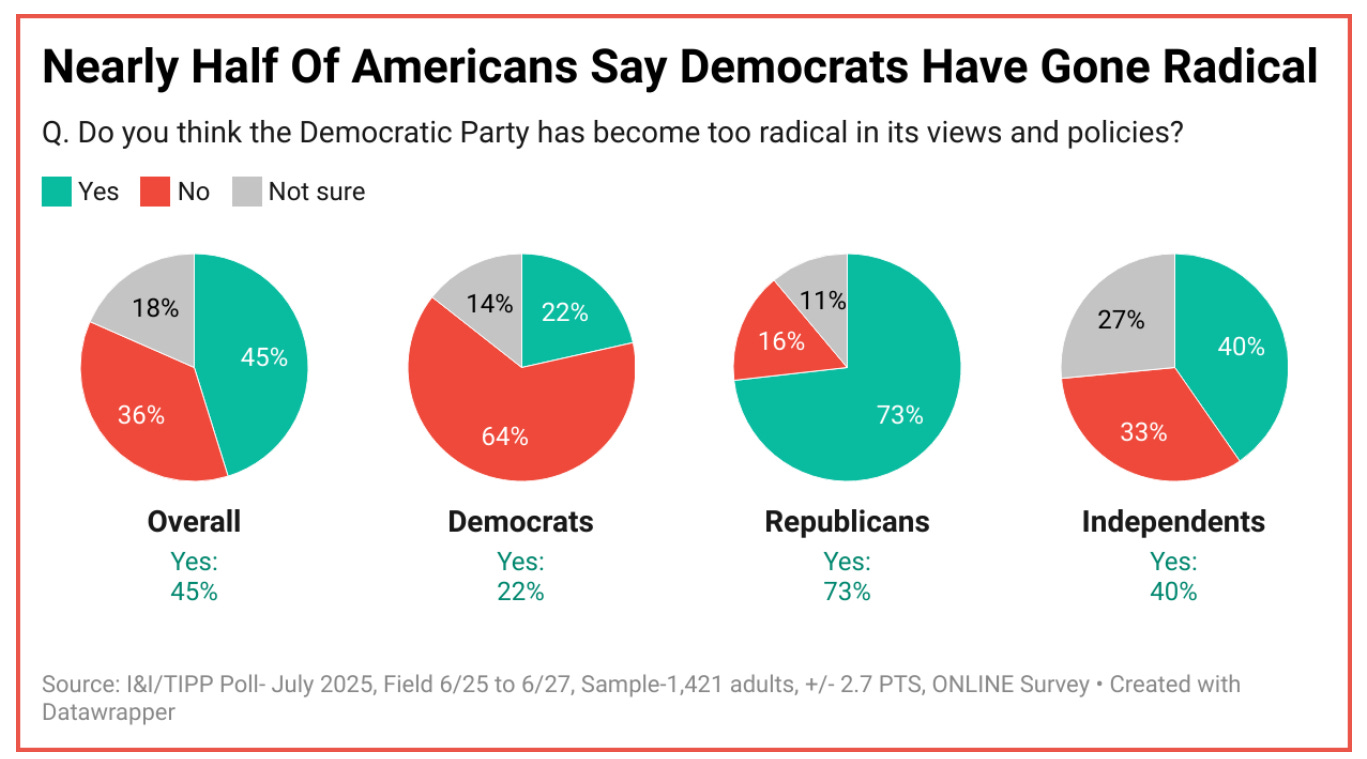 The Democratic Party is losing substantial support as 45% of voters, including one in five Democrats, now consider it “too radical,” according to the latest I&I/TIPP poll conducted late last month. This significant shift reveals a party facing serious challenges, with 64% of Americans viewing Democrats as extreme or uncertain about their direction. The poll, with a +/- 2.7% margin of error, exposes a leadership gap—37% of voters cannot identify a Democratic leader, with Kamala Harris barely reaching 10%.