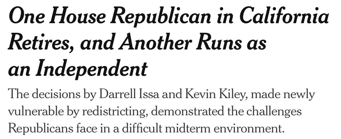 Before we get to my reading recommendations (there are a bunch), there are a couple of breaking stories from yesterday worth sharing. The first of which is that Congressman Darrell Issa, with dramatic flair, announced at the end of the filing period that he is not running for the newly drawn, blue-tilted 48th Congressional seat, and is retiring from Congress. He’s endorsed San Diego County Supervisor Jim Desmond for that race instead. The second interesting story is that while Congressman Kevin Kiley had announced recently that he was running for the blue-tilting 6th Congressional seat, today he announced he was running as an independent, not as a Republican. He goes into the why of it, from his point of view, here. I’m sure I will have more to say about these things, but it’s my day off (ha)!