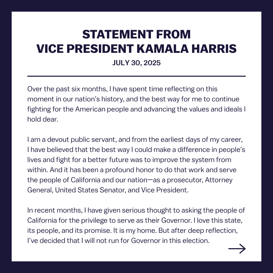 Earlier today former Vice President Kamala Harris put out an announcement that she is not running for Governor of California. Above is a video just over three minutes long where I give you my first impressions about this very big decision for Harris, and of course it has implications for the 2026 Gubernatorial elections here, and the 2028 Presidential election. I hope you will take a short break and check out what I have to say.