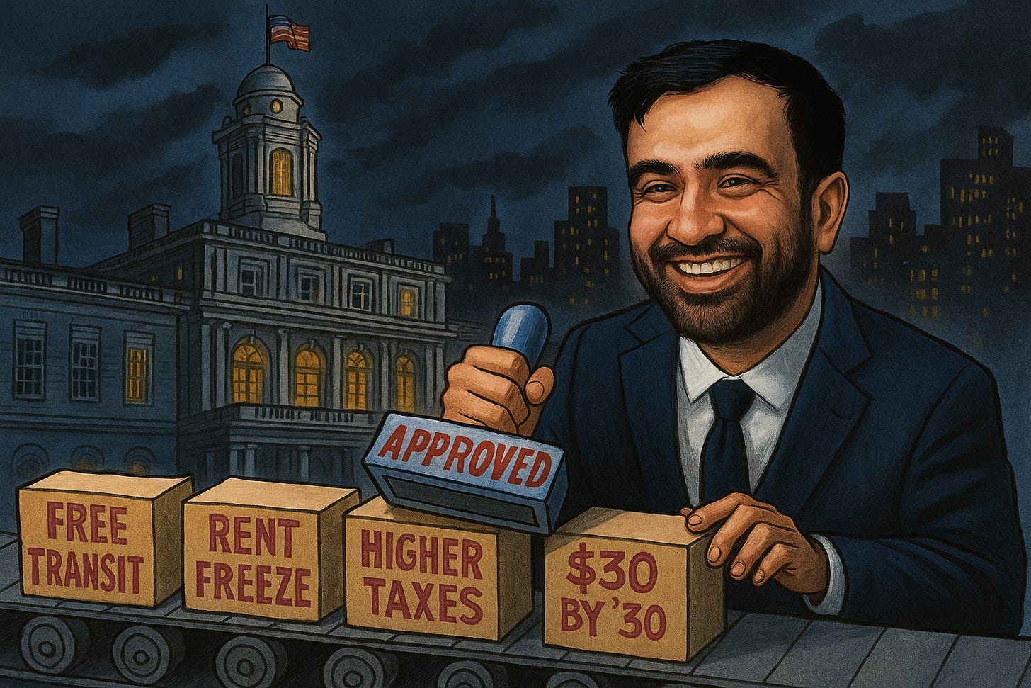 Mamdani’s platform leaves no doubt. He supports expanding government programs, including free bus service, universal childcare, and tuition-free CUNY, all of which would be financed through new and higher taxes. His plan raises taxes on corporations and high earners and reinstates congestion pricing. He would fund city-owned grocery stores and enact a “$30 by ’30” minimum wage proposal that would more than double the state’s current wage floor by 2030.
