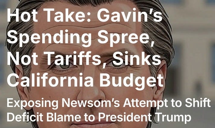 Governor Newsom decided to announce that, despite the profligate spending he has advocated for, that it was President Newson’s tariffs that were responsible for the state’s red ink…