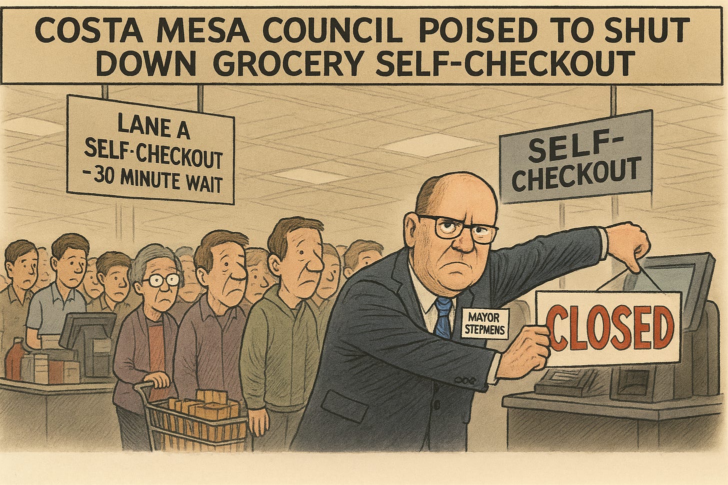 The ordinance Costa Mesa is considering mirrors Long Beach’s almost word-for-word: one employee per three kiosks, a 15-item cap, and a ban on self-checkout for any item kept in a locked case. That’s not modernization — it’s a slow walk back to 1995. And in Long Beach, we already know what happened: fewer options, longer lines, and higher costs. Stores didn’t magically become safer. They became slower and more expensive to operate.