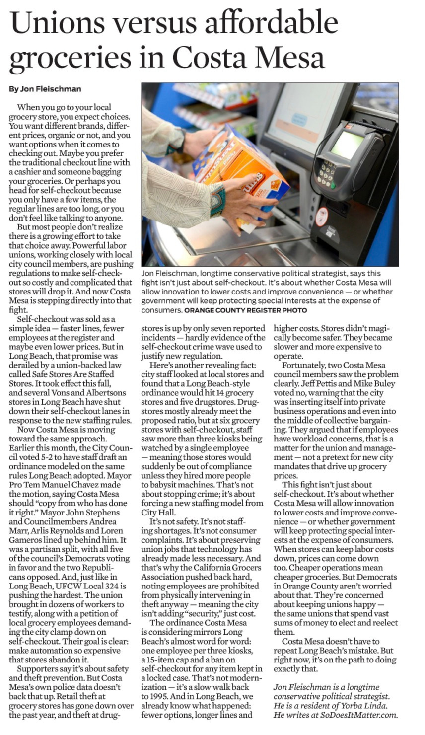This fight isn’t just about self-checkout. It’s about whether Costa Mesa will allow innovation to lower costs and improve convenience — or whether government will keep protecting special interests at the expense of consumers. Everyone knows we have an affordability problem in this county. Nowhere is that more evident than at the grocery store. When stores can keep labor costs down, prices can come down too. Cheaper operations mean cheaper groceries. But Democrats in Orange County aren’t worried about that. They’re concerned about keeping unions happy — the same unions that spend vast sums of money to elect and re-elect them.